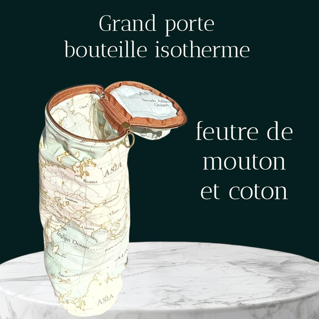 Grand porte bouteille coton épais et doublé en laine de mouton feutrée, isolant nature. Peut contenir une grand bouteille d'eau.